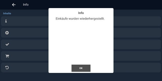 Nach Updates kann es sein, dass eure Käufe wieder aktiviert werden müssen. Hierfür nutzt bitte die Aktion "Einkäufe wiederherstellen". Dabei fallen keine weiteren Kosten an. Was ihr einmal gekauft habt, bleibt für den jeweiligen Account natürlich erhalten.