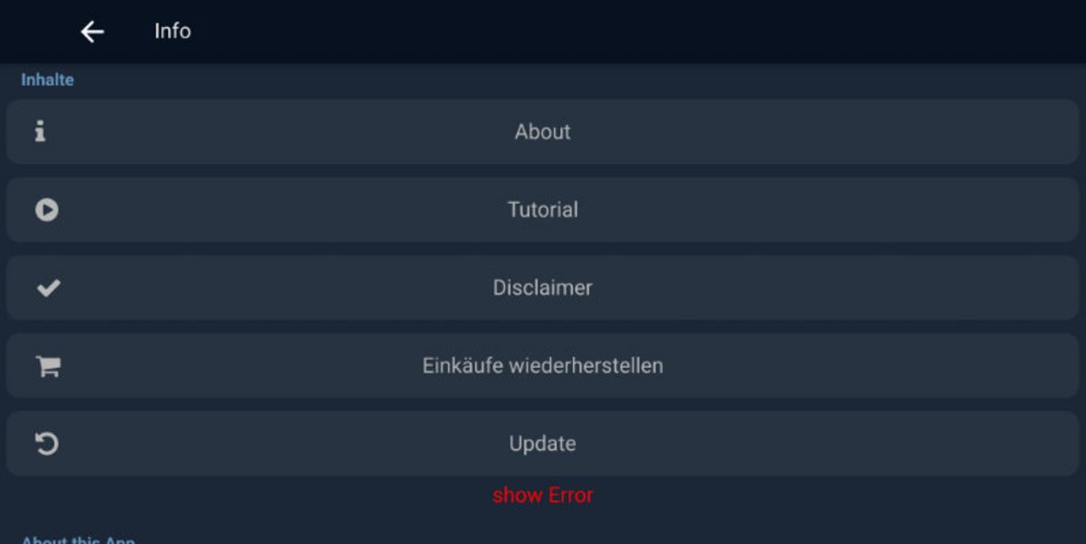 Sollten aufgrund eines gescheiterten Updates (z.B. bei schlechter oder Abbruch der Internetverbindung) Daten nicht vorhanden sein, ist es natürlich kostenfrei möglich, die App zu deinstallieren und wieder neu zu laden. Ein Fehlen der Daten zeigt sich unter iOS mit einer komplett weißen Inhaltsseite, unter Android steht hier zusätzlich in schwarzer Schrift, welche Daten nicht vorhanden sind.